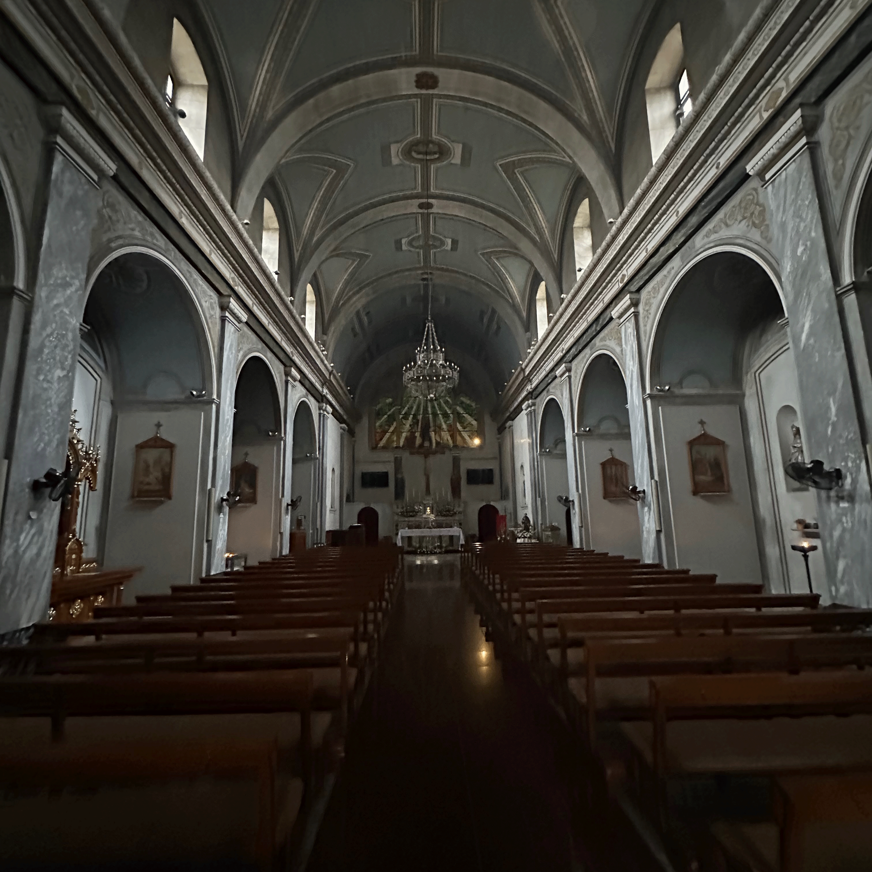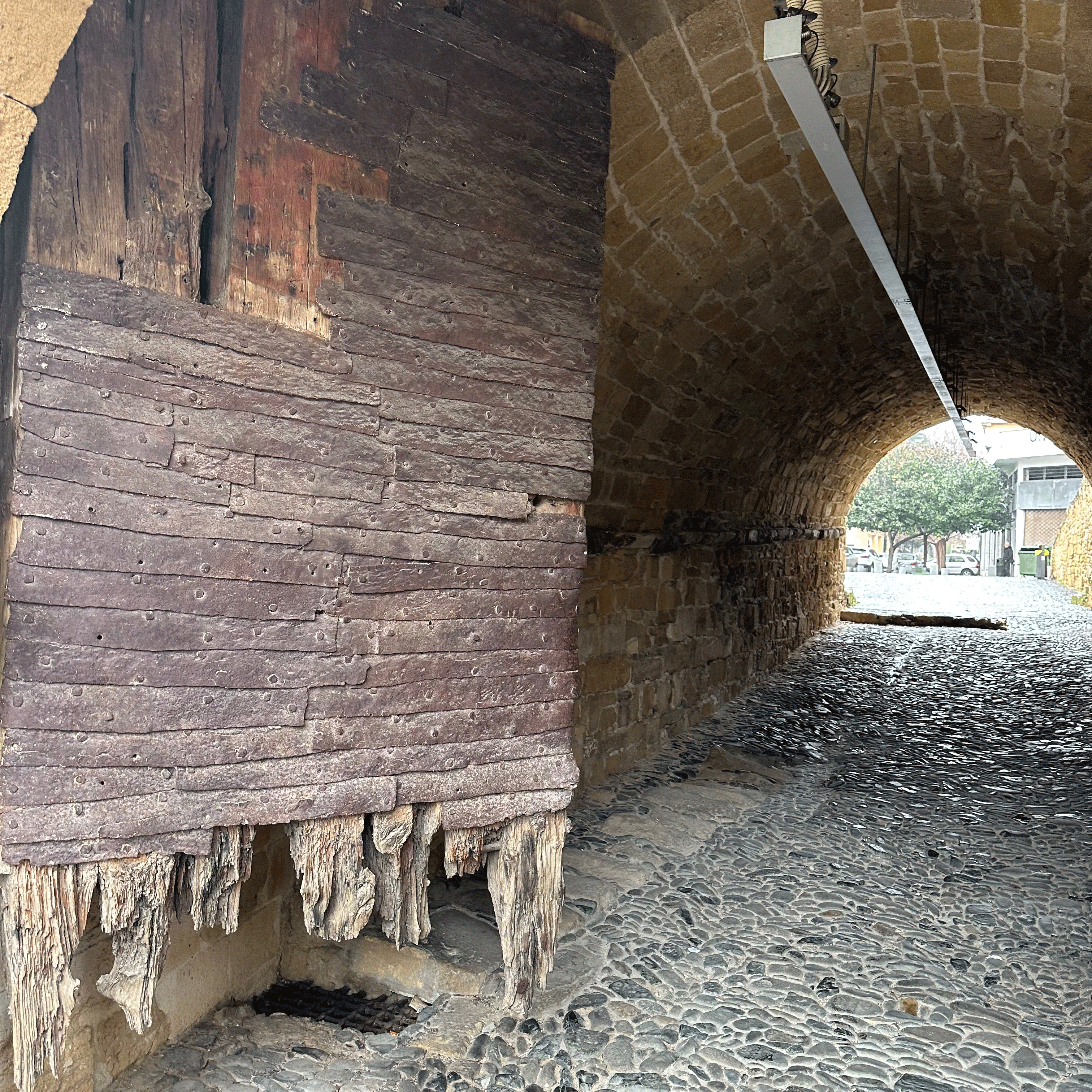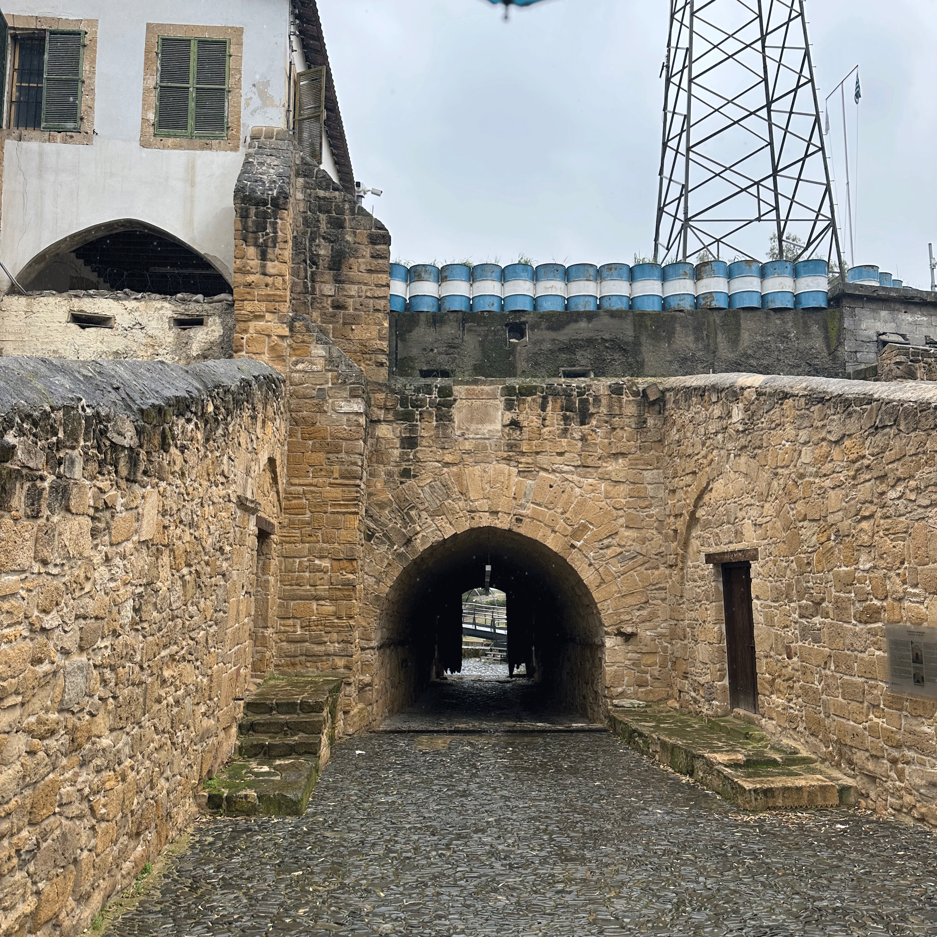 We bought our bus passes at the main terminal, a ten minute walk to the end of the promenade. The bus stop was right across the street from our apartment. It rained on the day we went; one of our few rain days in Cyprus. Unfortunately, nothing ever looks as good in the rain. We hunkered under our umbrella and walked from the bus depot to the Paphos Gate, the last city gate through the city walls built by the Venetians (1489-1571). We walked through the gate for an outside view of what’s left of the wall. There wasn’t much to see, so we headed back in. Near the gate, inside the walls, is The Church of the Holy Cross, a Catholic Church. There are still Roman Catholics in Cyprus, even though most of the country is Eastern Orthodox. The rear exit of the church is sealed as it is on the Turkish side. On a hill beyond the church, a Turkish flag was visible. Other than that, we saw no evidence of the divided city or UN Green Line.