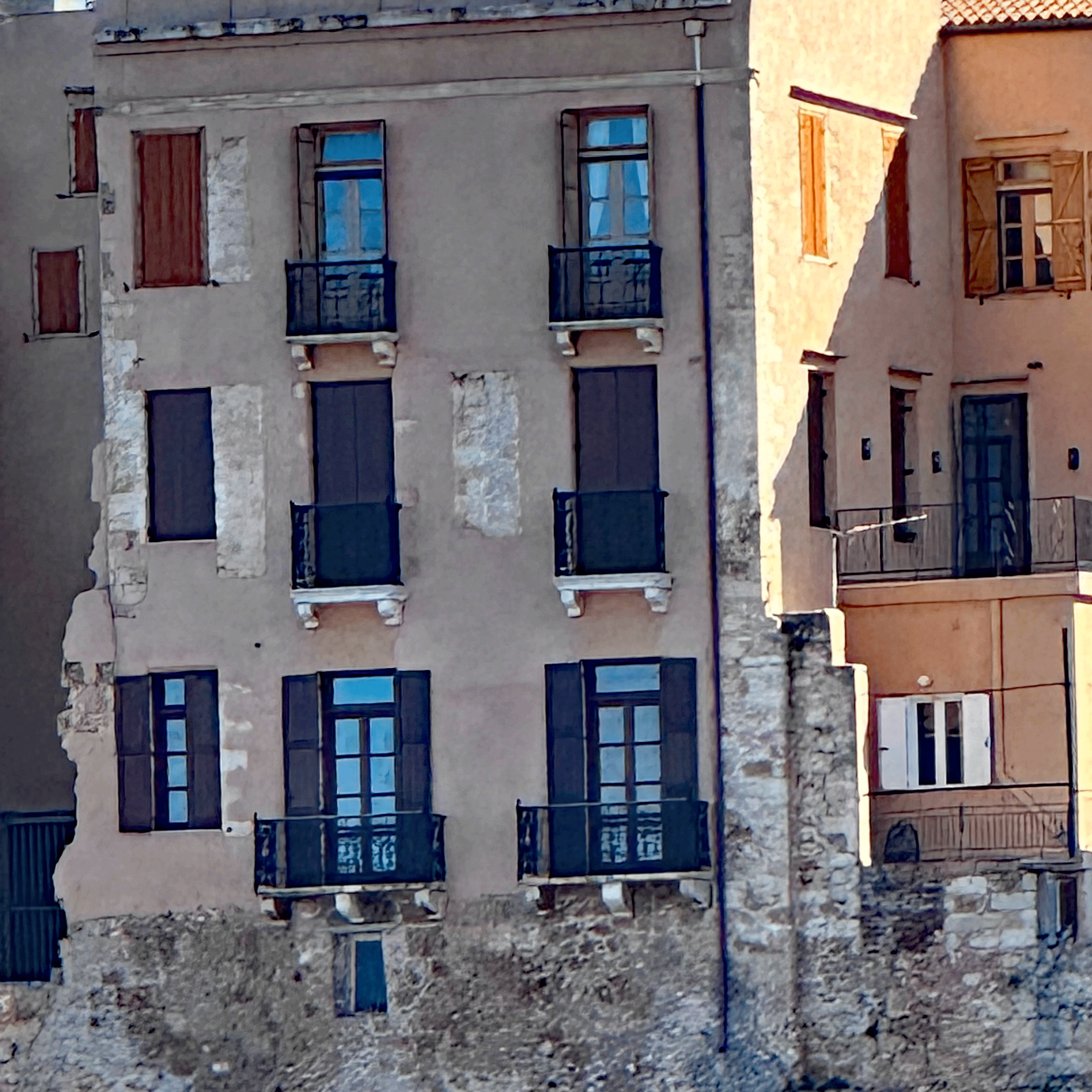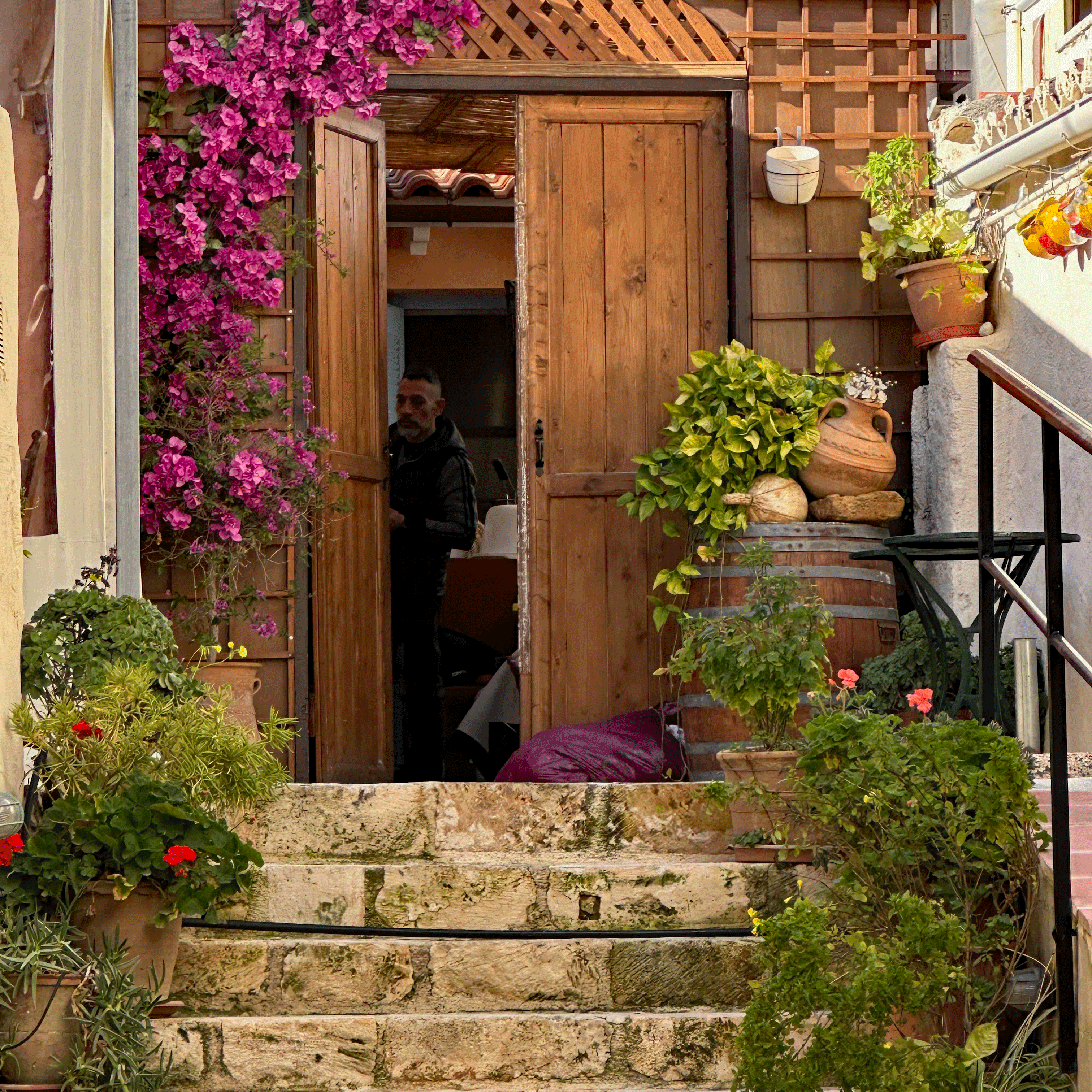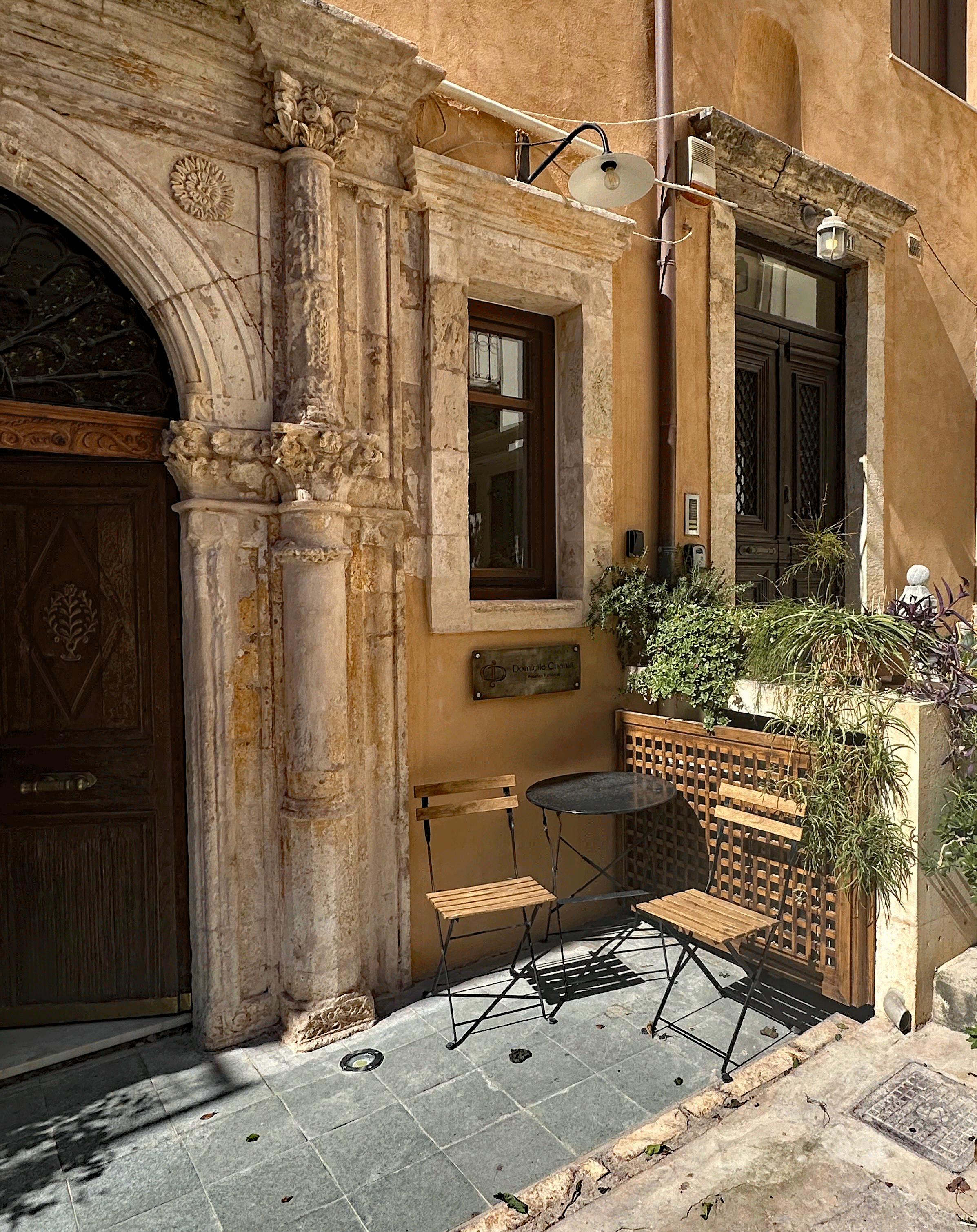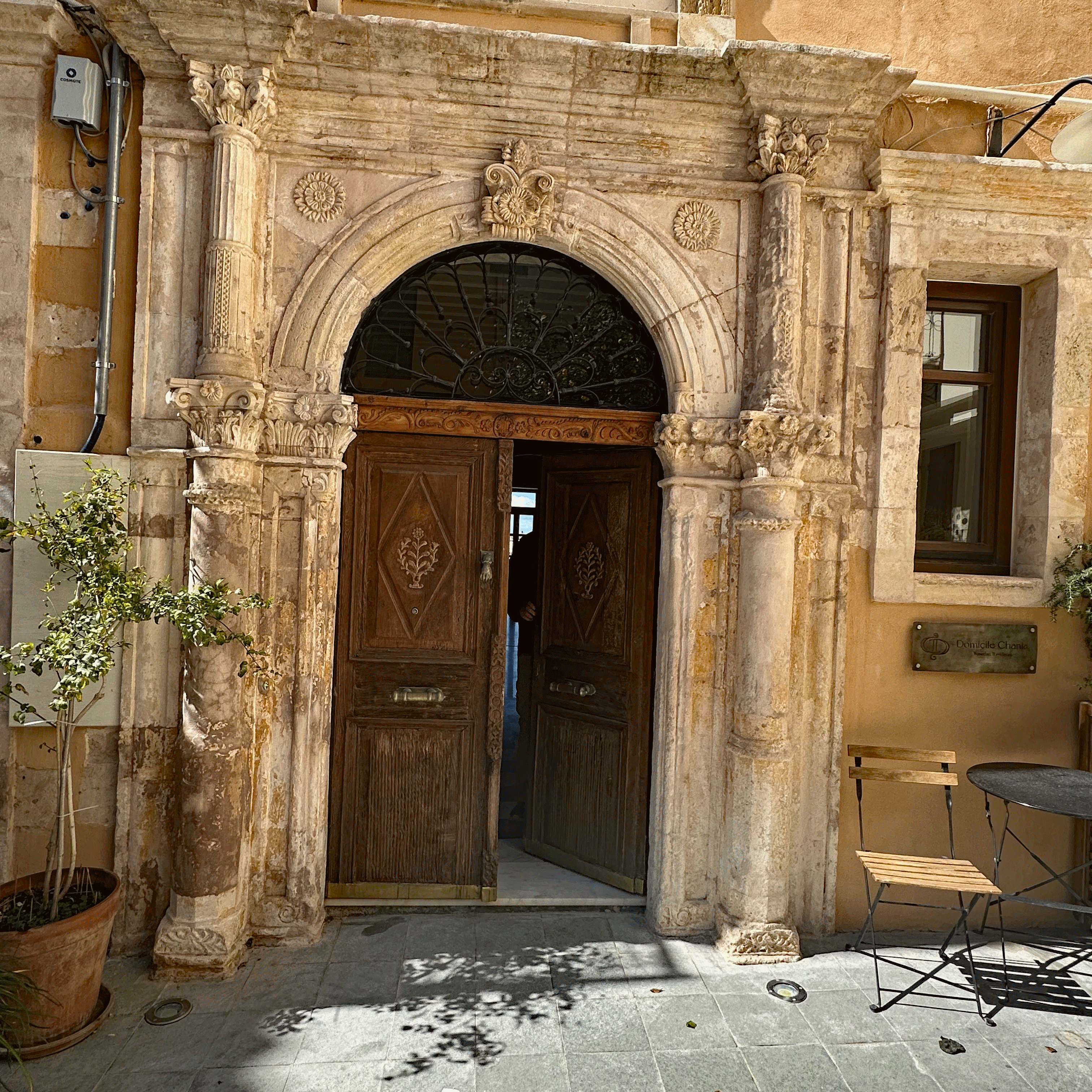Tosis, our host met us on the street and carried my luggage, while expressing his pleasure to meet us and proudly pointing out the features of our home for the next ten days. The building belonged to a governor during the Venetian Occupation (13th-17th century). The first level was his office and library and living area was above. We are staying in the restored and refurbished archive area. In keeping with strict archeological standards, the stone archways are original, the ceiling heights and window frame measurements are as they were in the 1300’s. The balcony metalwork was reproduced to strict historical requirements. Even wall paint colors must be approved.The stone archways are original , the wooden entry door is 100 years old. The antique furnishings blend seamlessly with the modern amenities. Tosi had equipped the bathroom and kitchen with essential items to get us started, even homemade biscuits and jam and a bottle of his private label wine.