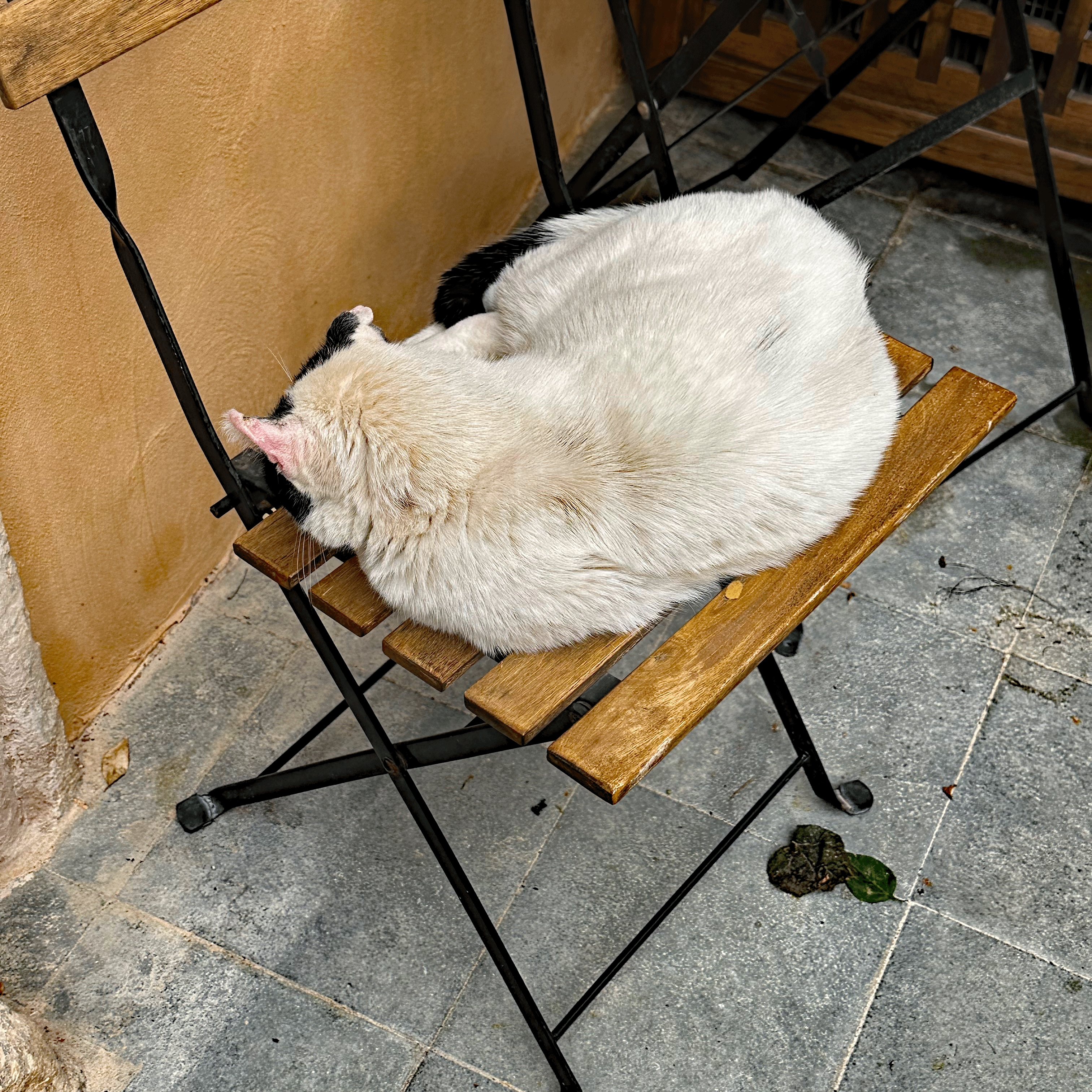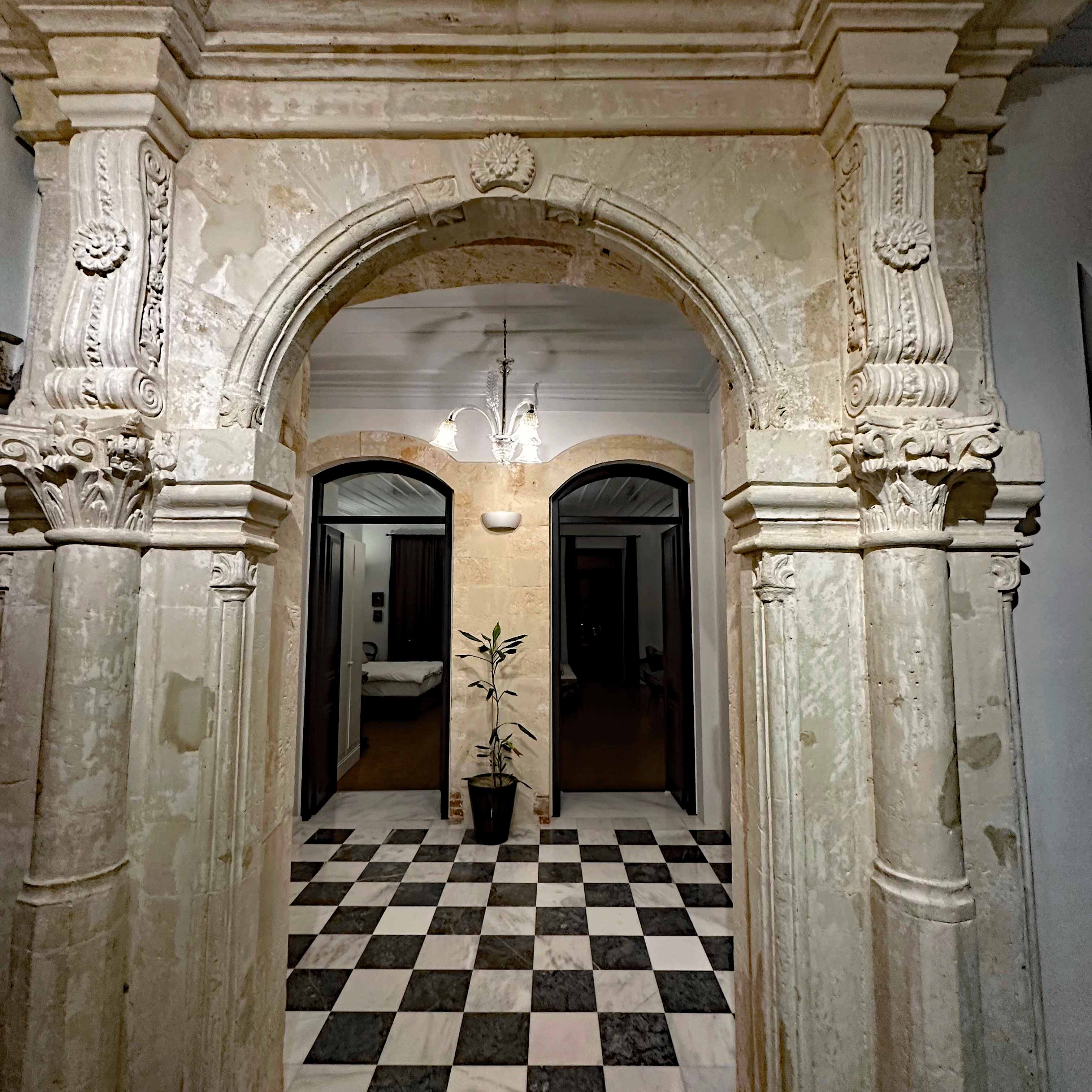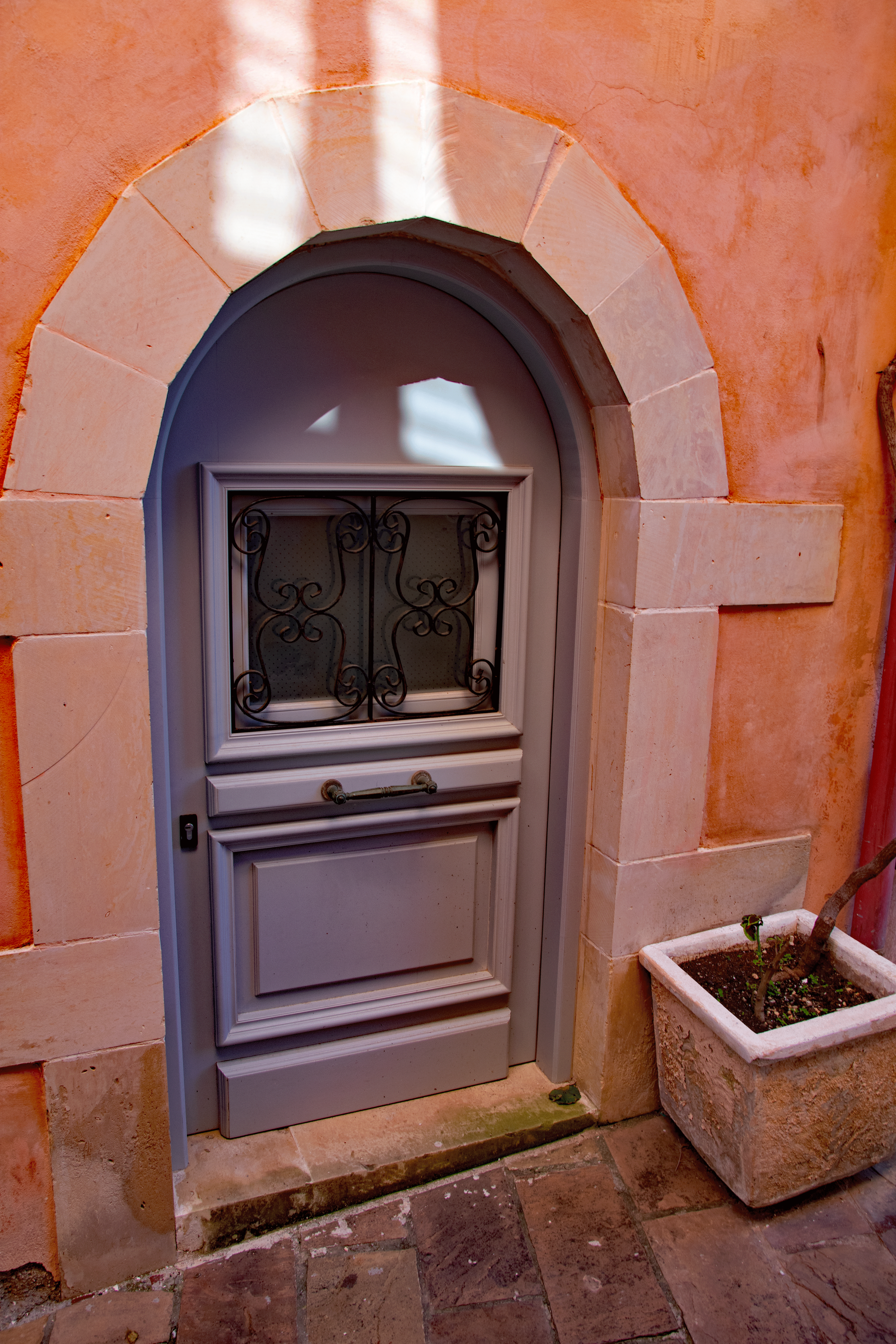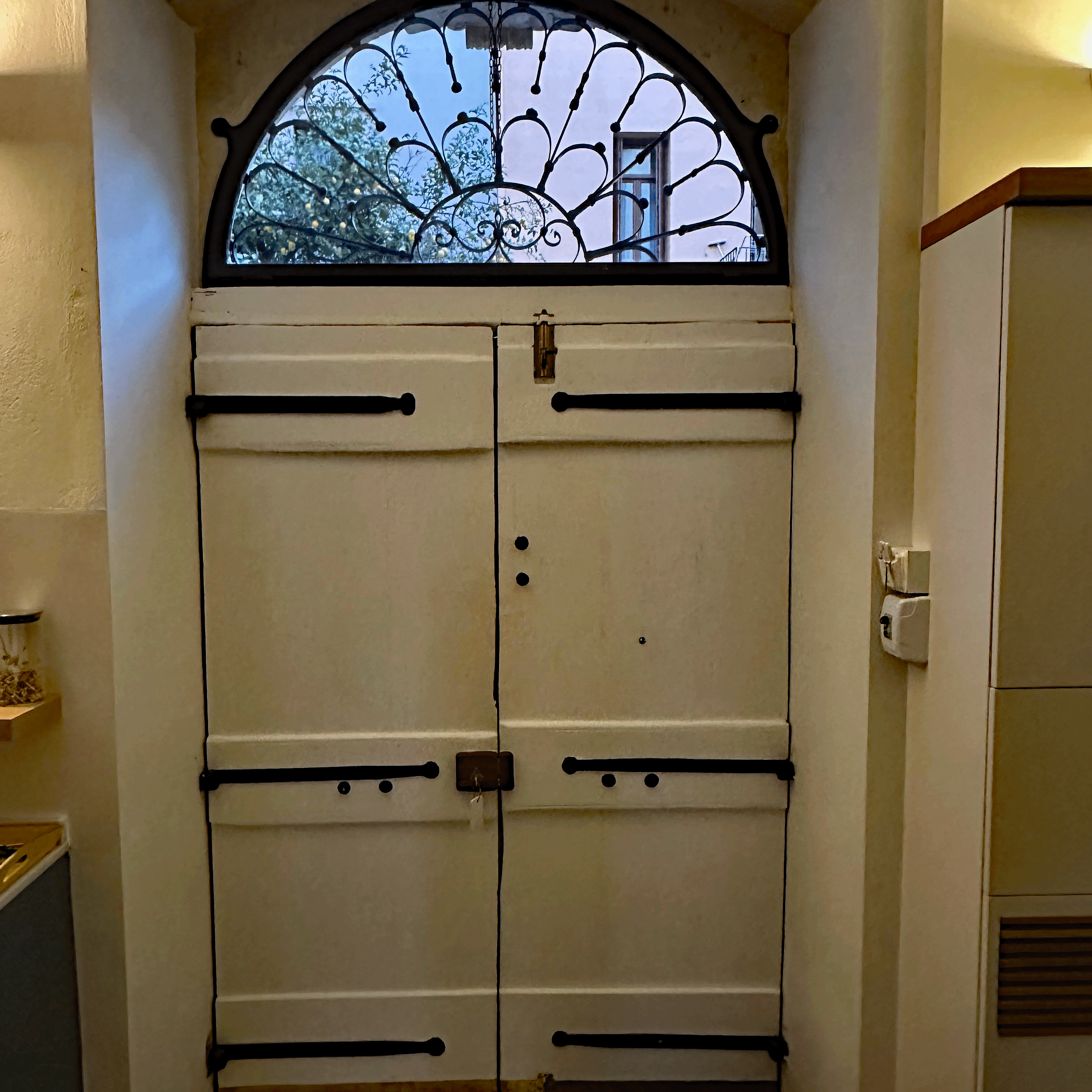 Tosis, our host met us on the street and carried my luggage, while expressing his pleasure to meet us and proudly pointing out the features of our home for the next ten days. The building belonged to a governor during the Venetian Occupation (13th-17th century). The first level was his office and library and living area was above. We are staying in the restored and refurbished archive area. In keeping with strict archeological standards, the stone archways are original, the ceiling heights and window frame measurements are as they were in the 1300’s. The balcony metalwork was reproduced to strict historical requirements. Even wall paint colors must be approved.The stone archways are original , the wooden entry door is 100 years old. The antique furnishings blend seamlessly with the modern amenities. Tosi had equipped the bathroom and kitchen with essential items to get us started, even homemade biscuits and jam and a bottle of his private label wine.