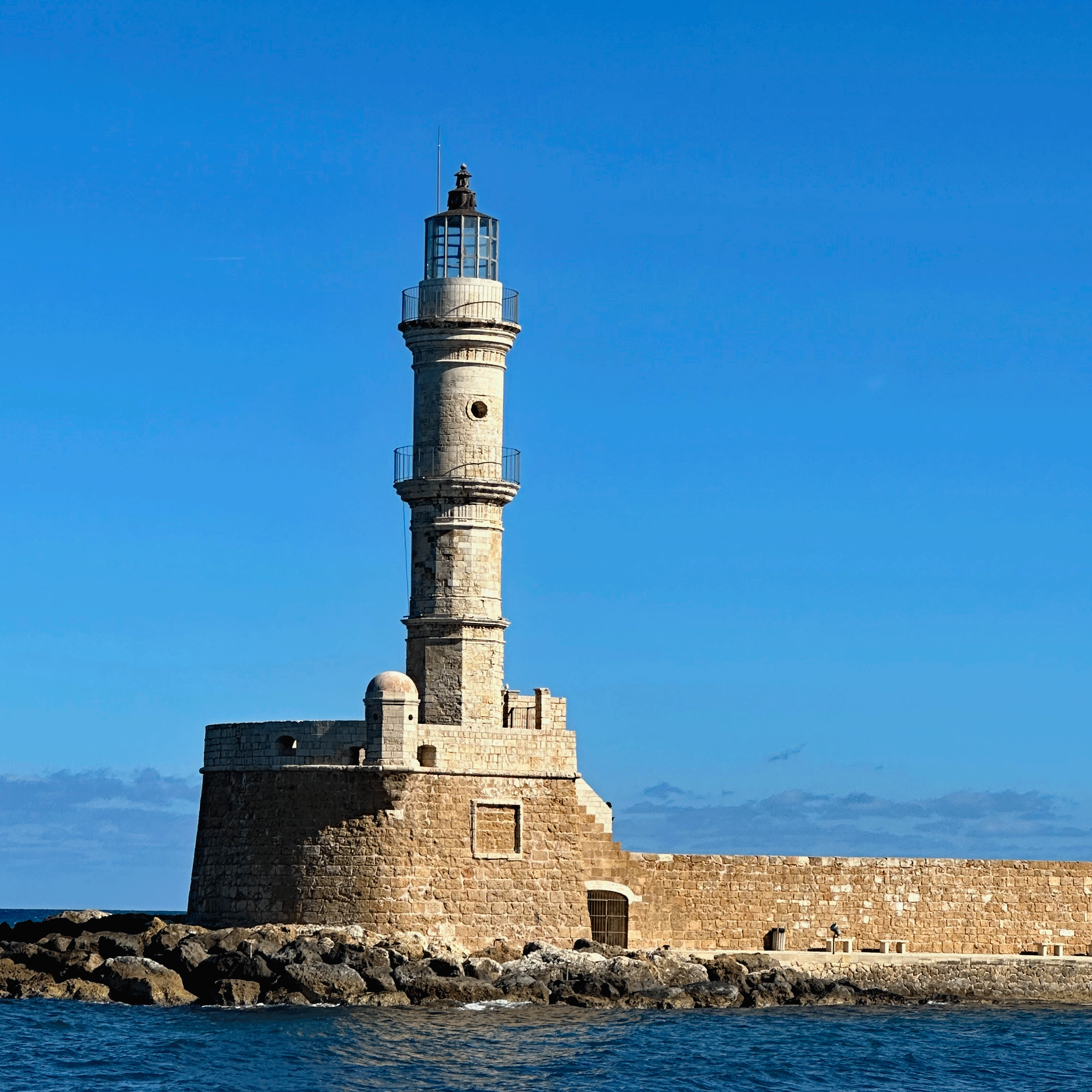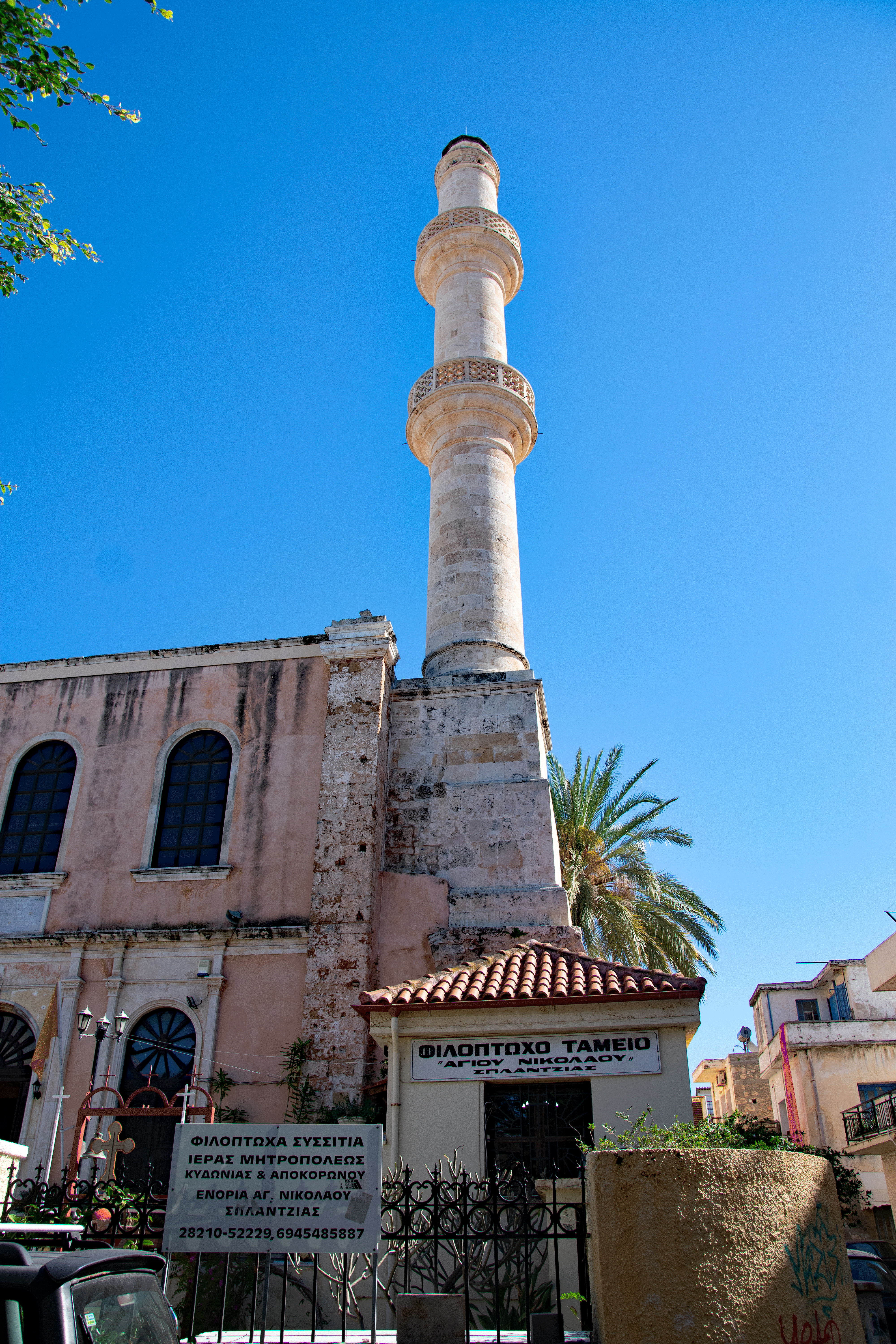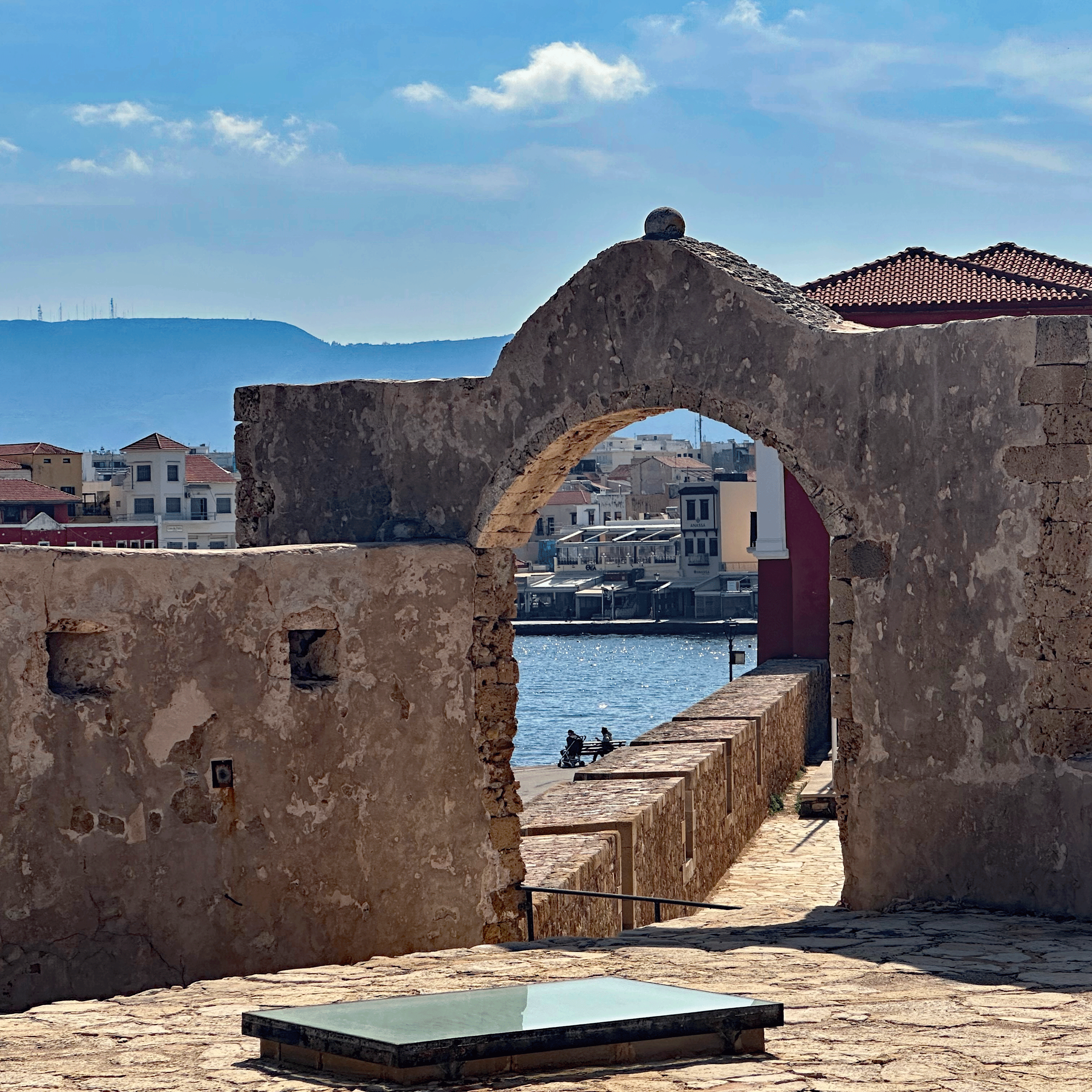 We left the “main drag” to stroll back alleys and narrow lanes, knowing we were walking on top of millennia of human history. Humans have lived and died in this part of the world since the Paleolithic Age. (more on that when we visit the Archeology Museum of Chania). Due to natural disasters (earthquakes and tsunamis) and wars, remains of the Byzantine era (330-1200 AD) and the subsequent Arab occupation (824-961 AD) are scarce, but parts of the original Byzantine city wall are still visible. Many more of Chania’s buildings from the Venetian (1204-1645 AD) and Ottoman (1645-1898 AD) occupations can be seen today. The different cultures are most obvious in the places of worship that have served as Orthodox churches or as mosques, at various times. Our tour finished with Greek coffee on the waterfront where old Greek men play backgammon with their friends.