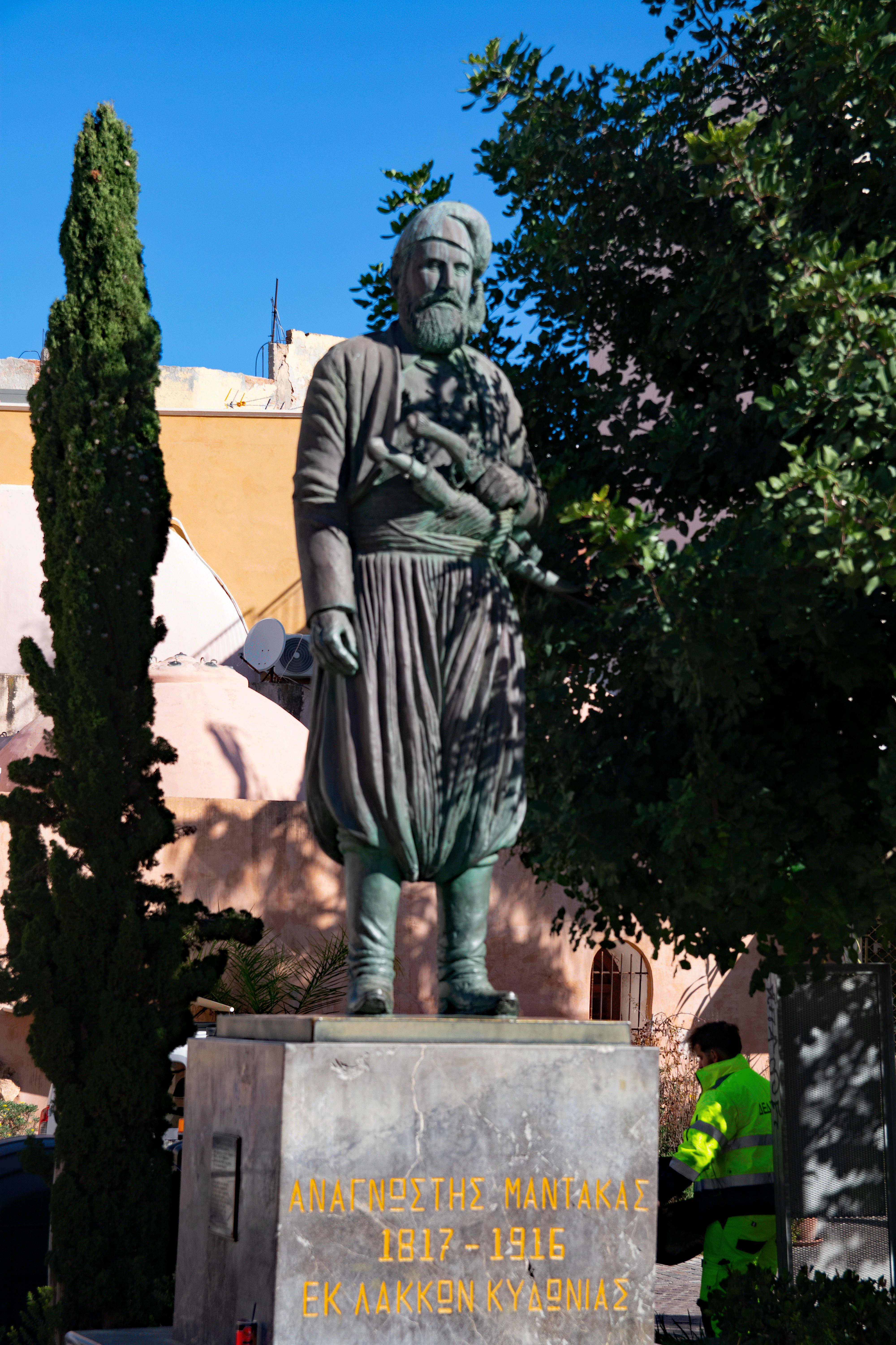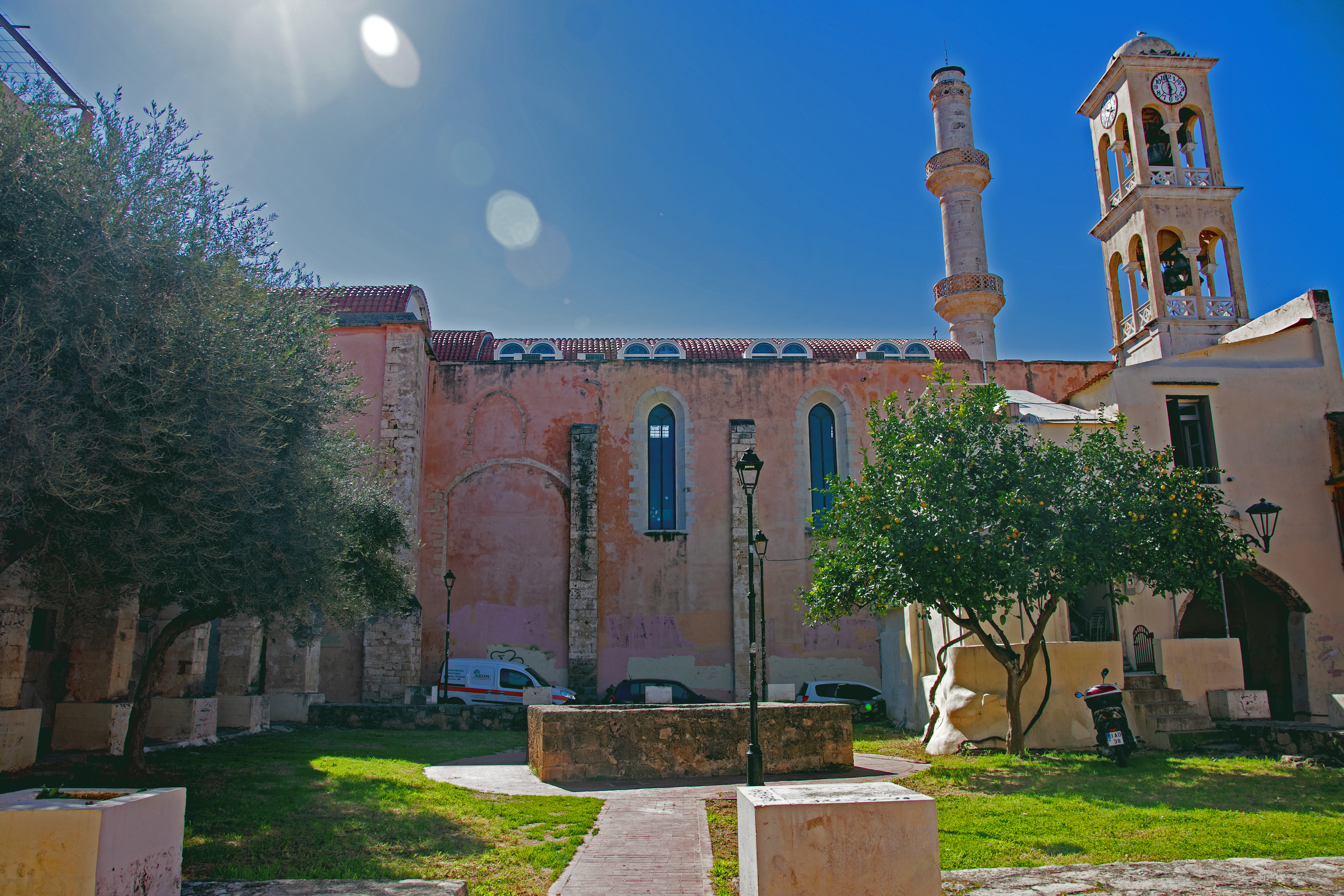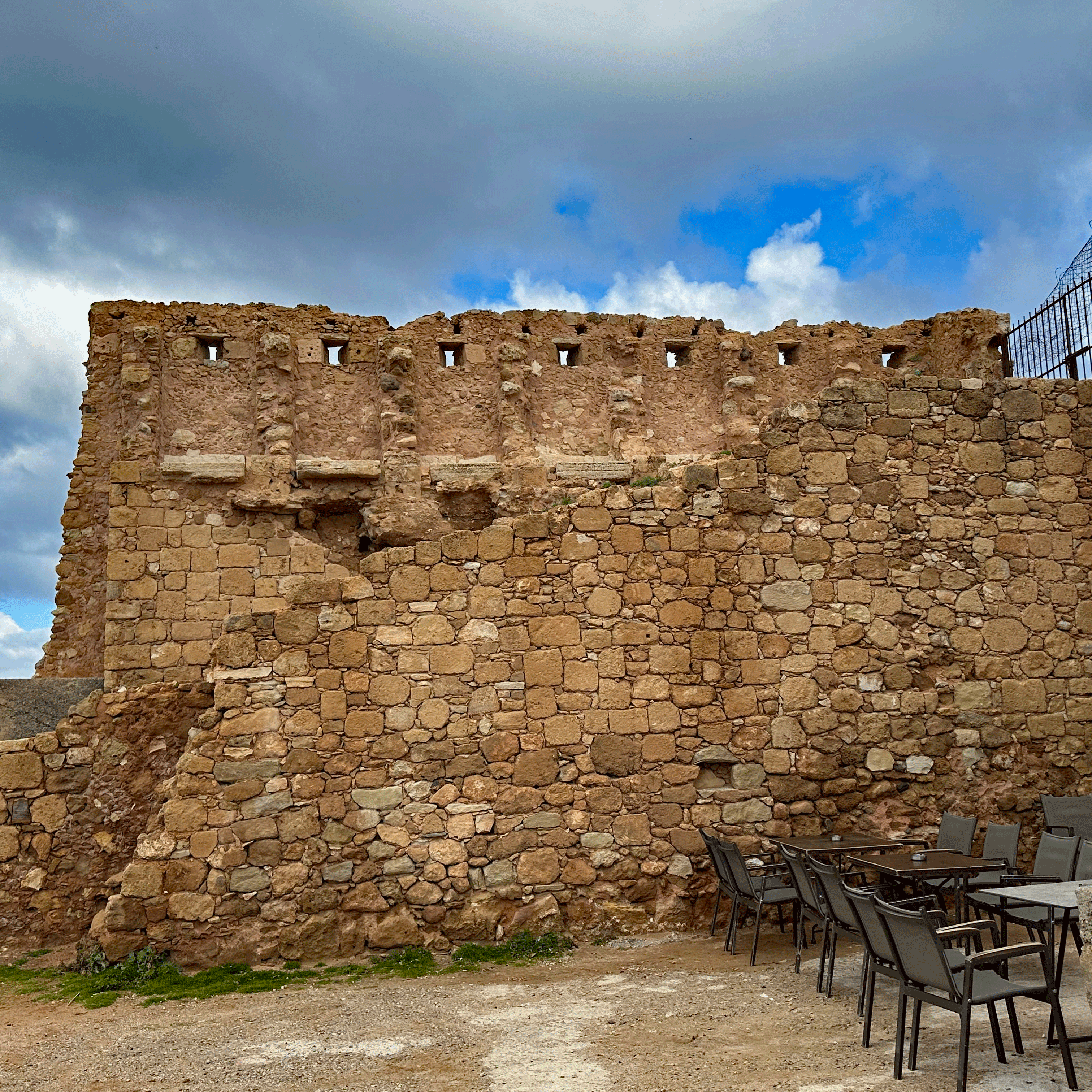 We left the “main drag” to stroll back alleys and narrow lanes, knowing we were walking on top of millennia of human history. Humans have lived and died in this part of the world since the Paleolithic Age. (more on that when we visit the Archeology Museum of Chania). Due to natural disasters (earthquakes and tsunamis) and wars, remains of the Byzantine era (330-1200 AD) and the subsequent Arab occupation (824-961 AD) are scarce, but parts of the original Byzantine city wall are still visible. Many more of Chania’s buildings from the Venetian (1204-1645 AD) and Ottoman (1645-1898 AD) occupations can be seen today. The different cultures are most obvious in the places of worship that have served as Orthodox churches or as mosques, at various times. Our tour finished with Greek coffee on the waterfront where old Greek men play backgammon with their friends.