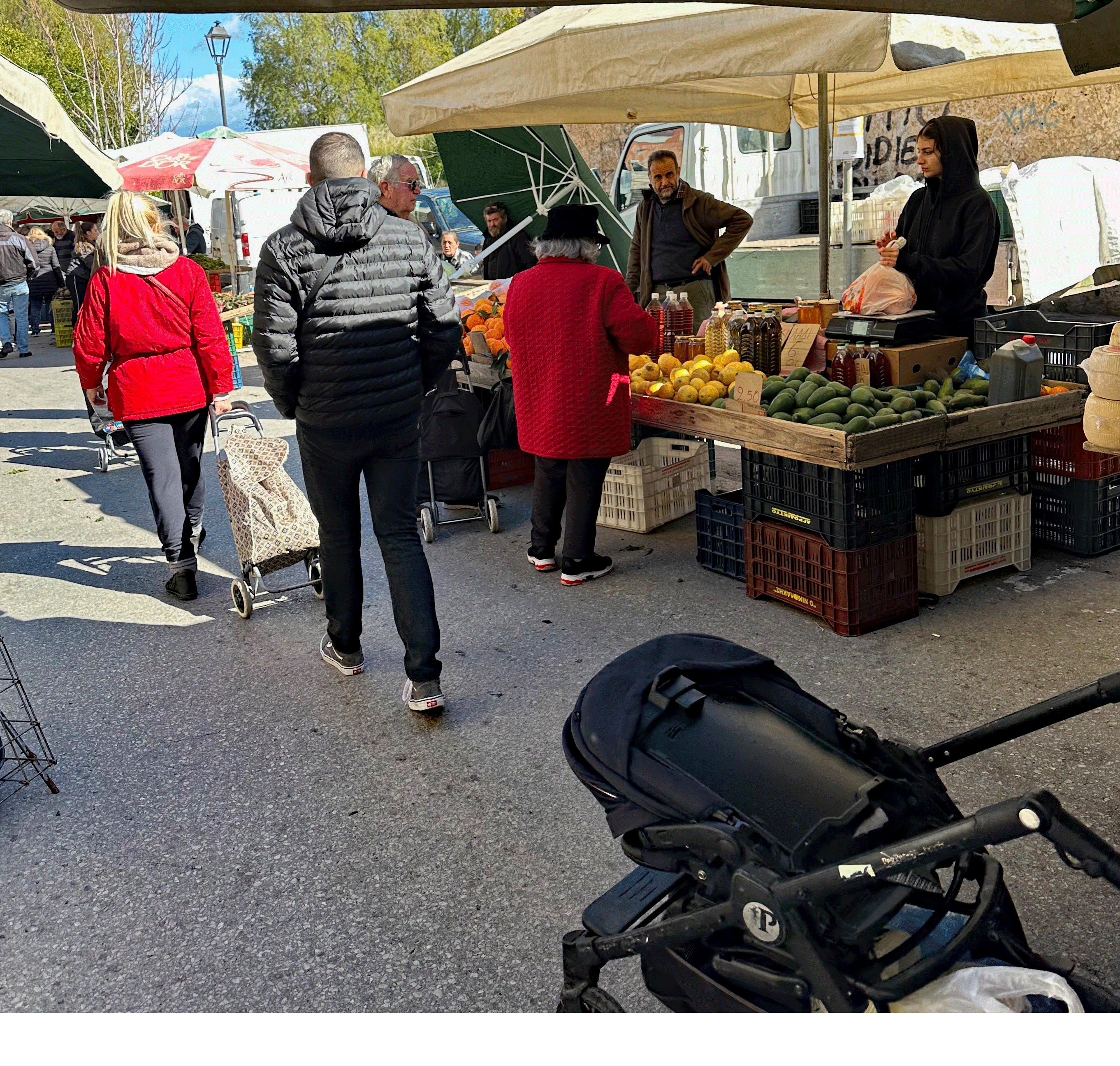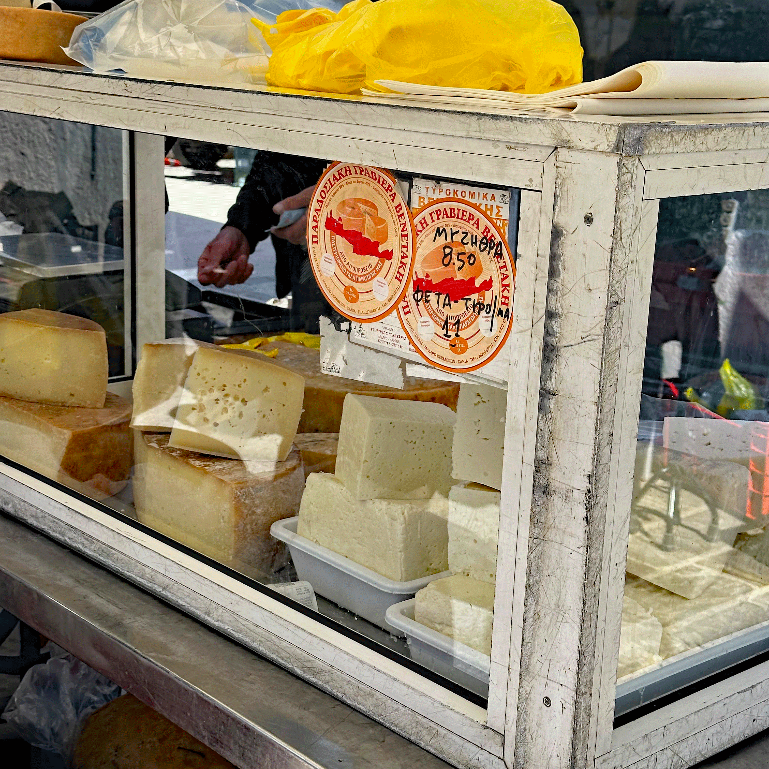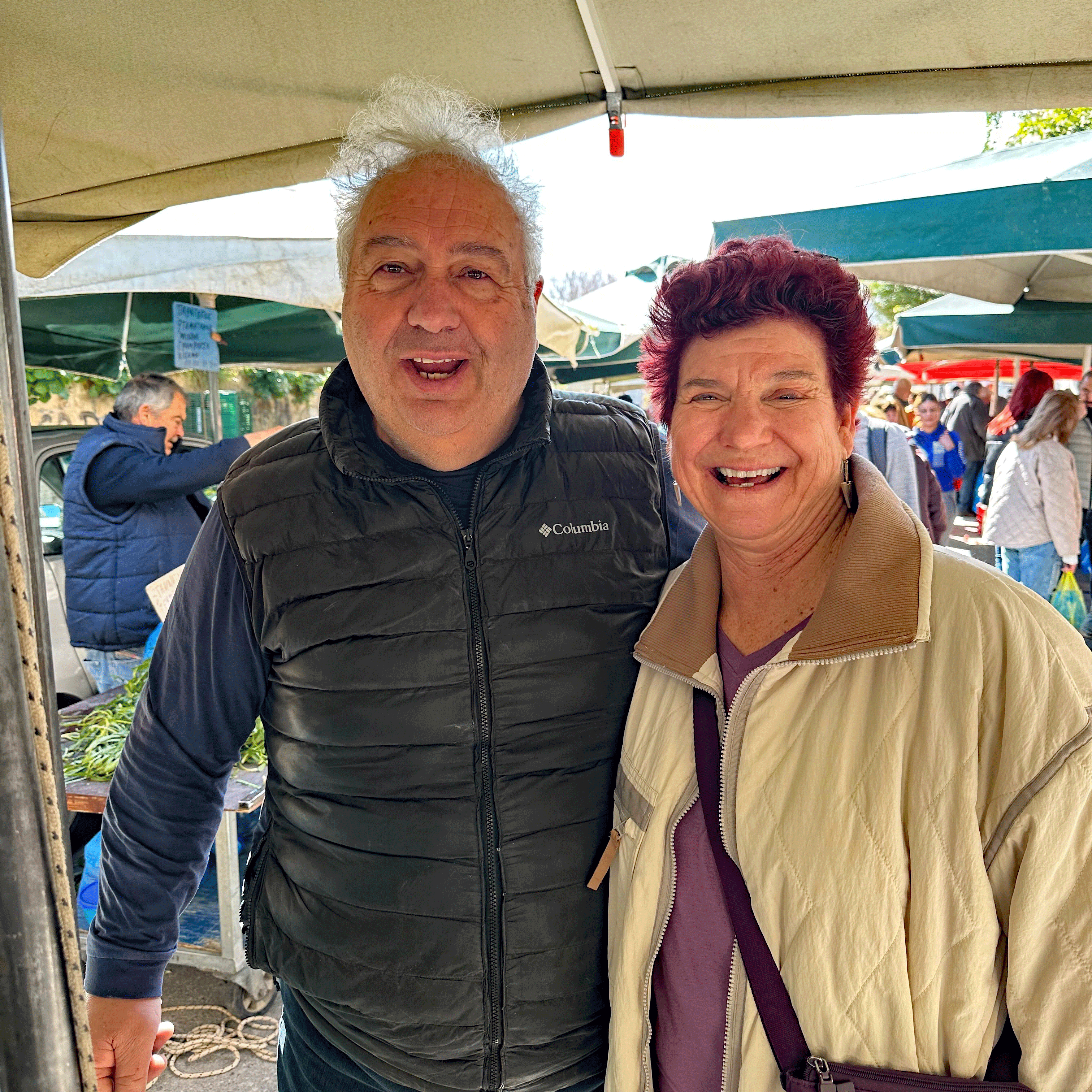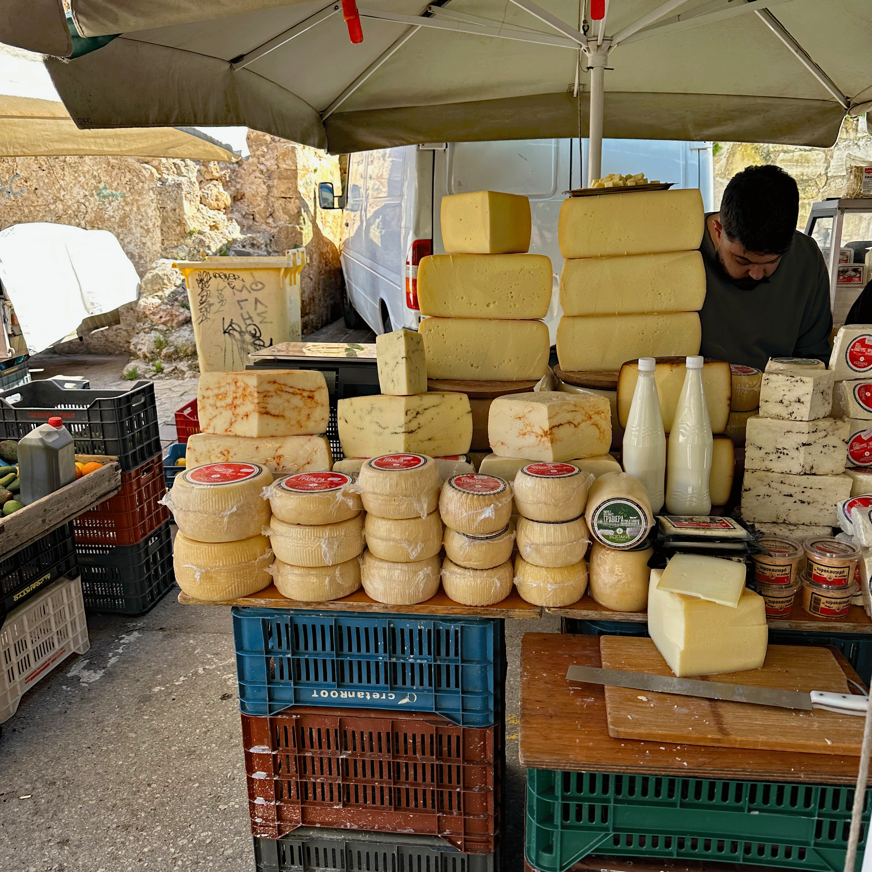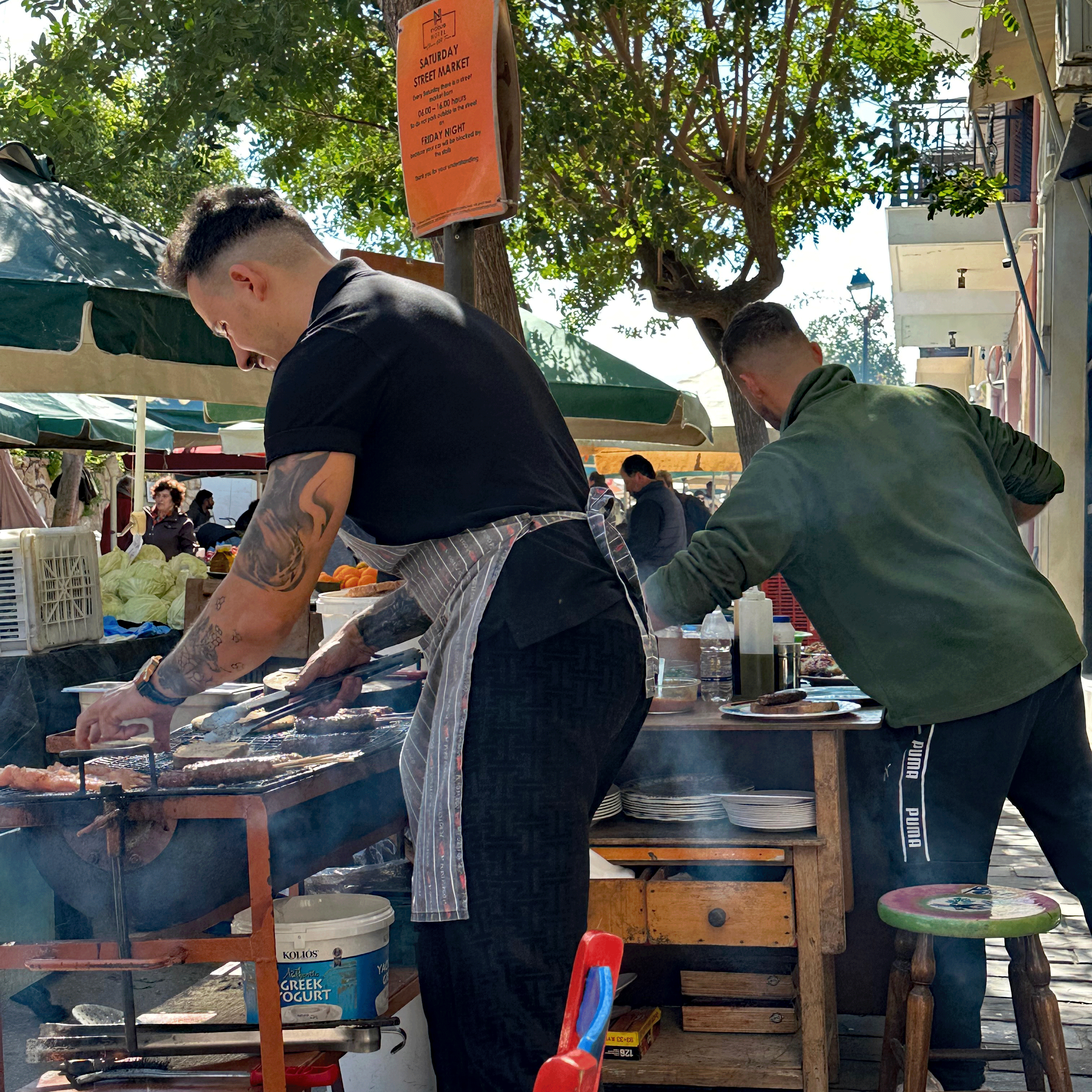 Another local experience in Chania is the Saturday Market. Fresh produce, olive oil, honey, and cheeses cover the tables lined up on two sides of Minoos Street. It is a great place to grab a fresh grilled souvlaki with a slice of bread for 1.5 euro; a little bit more for a “plate” and a beverage that is served at a sidewalk table, perfect for people watching. We met a nice Canadian couple there and have dinner plans with them tomorrow night.