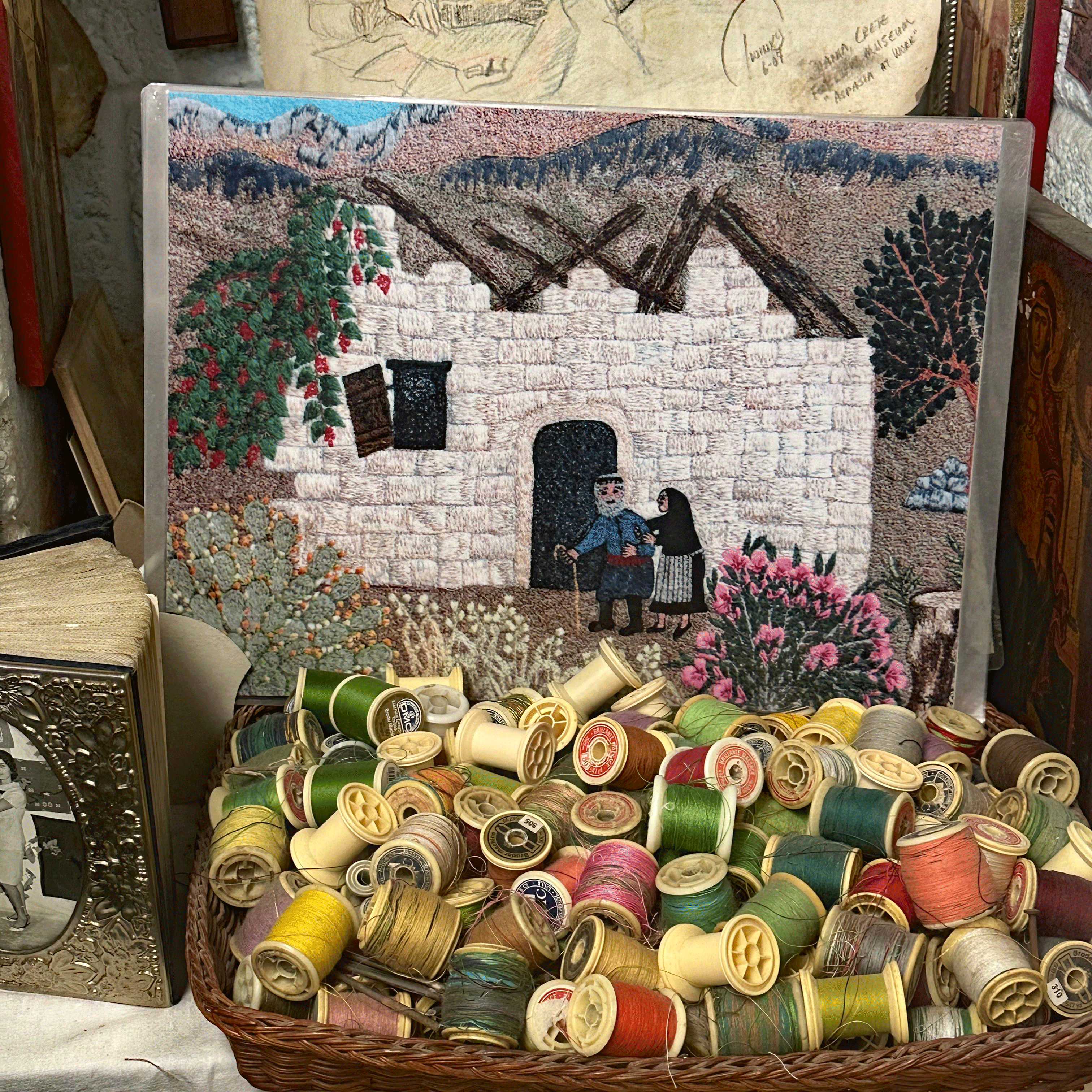 The Chania Folklore Museum is a funky little place next to the Catholic Church. It is filled with farming tools, vintage looms, sewing machines, flatirons, rugs, tapestries, and linens. When we visited, I was able to chat with a local crafter who sewed scenes of her home village from memory.